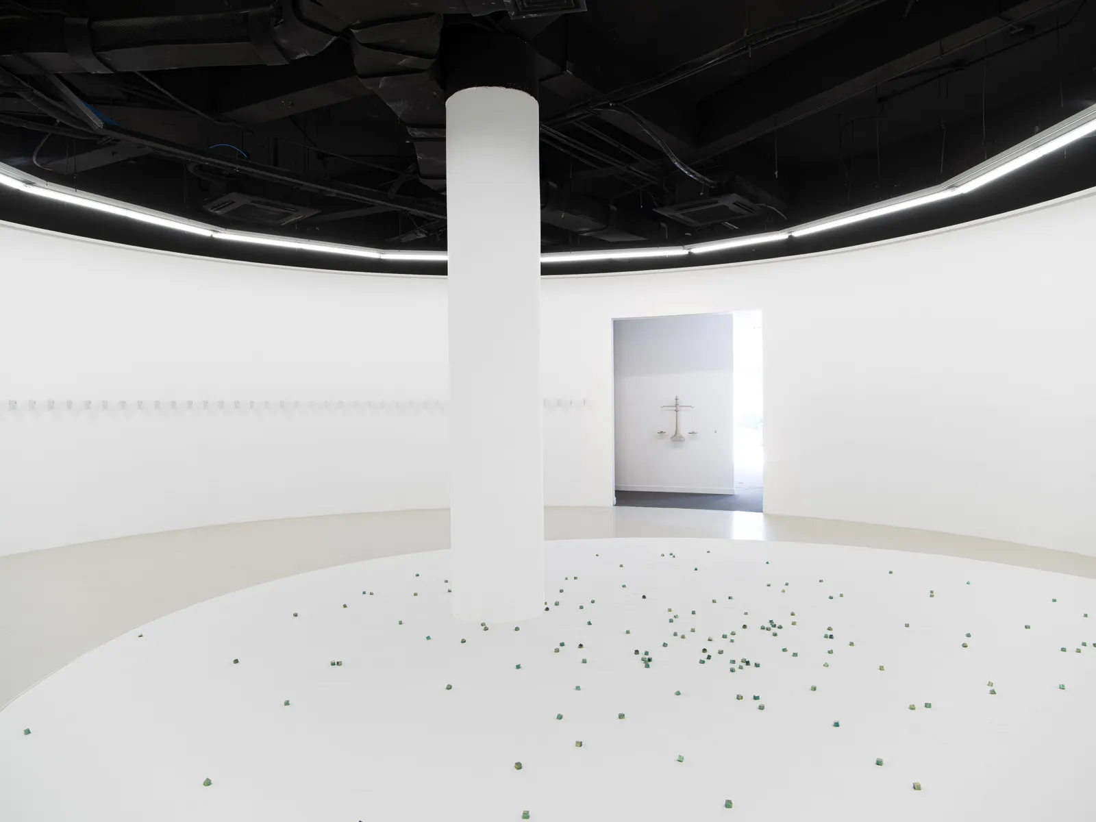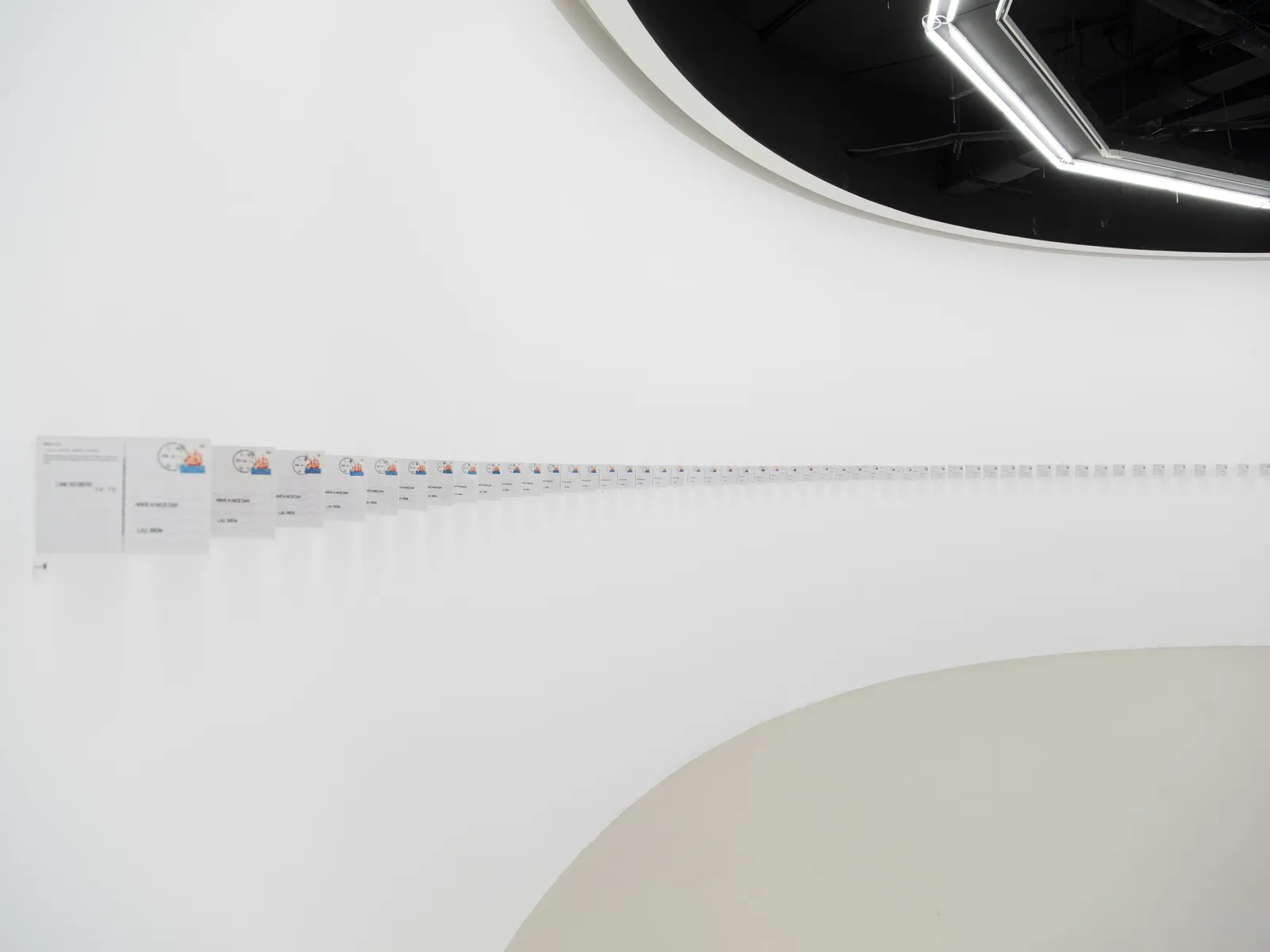 就策展而言,此次个展分为两大区域。在东画廊独特的圆形展厅内,呈现着《寸光阴-海粒》、《凝固的海》与《给自己的明信片》三件装置作品。其中,《给自己的明信片》共计88张明信片,乃是对河源温把时间视为存在证据的再度诠释与演绎。不同于他在1970年代向朋友们发送内容为“我还活着”的900封电报,在刘任的创作中,被证明对象与证明者合二为一。他寄信给自己,无疑是在时间之流中自我守望——让未来的自己见证此刻的我。如果说这件作品是在当下与未来的两端探讨时间性,那么《寸光阴-海粒》则是在真实与虚拟之间探索同一主题。刘任把一张购买于2011年的数字格式大海的图片分割成上千份,并且把它们逐一用丝网印刷的方式绘制在敷有金箔的压克力方块上。这些数以千计的海粒在展厅中被铺设在食盐上,形成某种取之于海又回填于海的视觉叙事。海是时间的隐喻。对于艺术家而言,食盐来自未曾见过却真实存在的海;海粒上的网购图片则是亲眼所见却虚拟存在的海。两者的交错感恰是人们对于时间的认知。相似地,《凝固的海》则探讨着时间的流动与凝固。在作品中,沙漏里原本存在的细沙被清空了,取而代之的则是一枚金箔亚克力海粒,由它哽住沙漏的细部。沙漏作为时间的换喻,由于流动性被凝固性取代,语义也指向了自身的反面——变为静态的此刻,